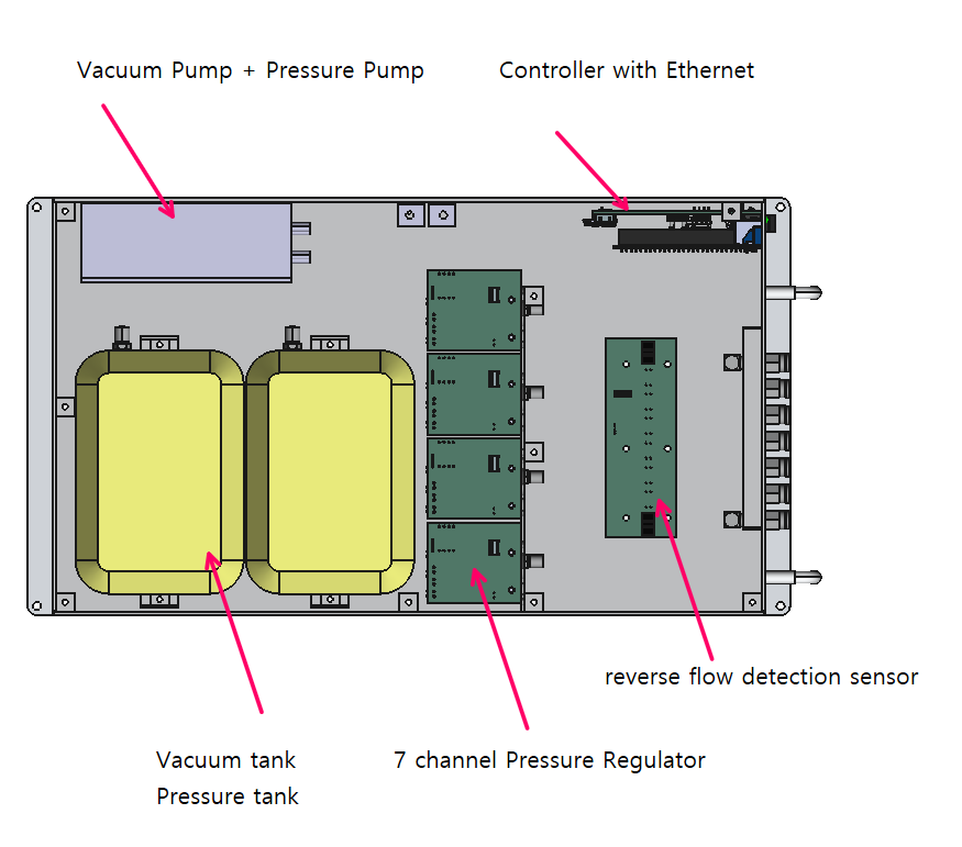 MPC7 is an independent 7-channel pressure controller for backpressure and purge pressure control in industrial inkjet printing applications. MPC7 has pressure generators inside for purge and backpressure control.