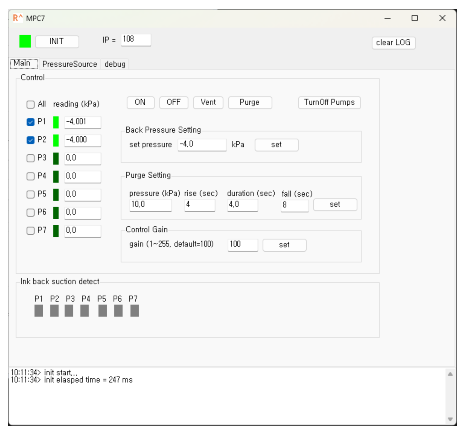 For backpressure control, MPC7 can generate negative pressure down to -20 kPa. For purge pressure control, it can generate positive pressure up to 40 kPa. Each channel can be independently controlled, allowing for precise pressure management for multiple print heads.
